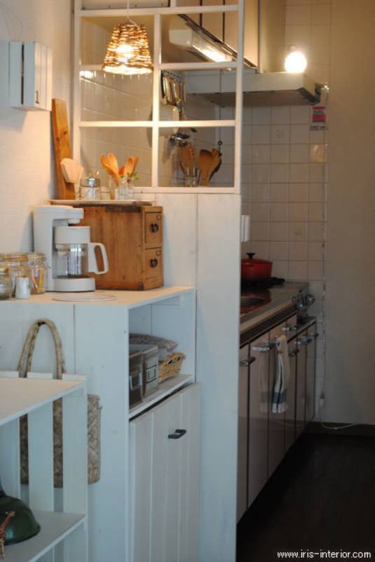 ご夫婦で手作りインテリアを楽しんでいるという美紀さんのお家。この壁面に並ぶ家具すべてがご主人との共同作品です。食器棚には1段だけ扉をつけるなど、手作りならではのこだわりが色々な所に詰まっています。いつも同じペンキを使うことが統一感を出すポイントだそうですよ。