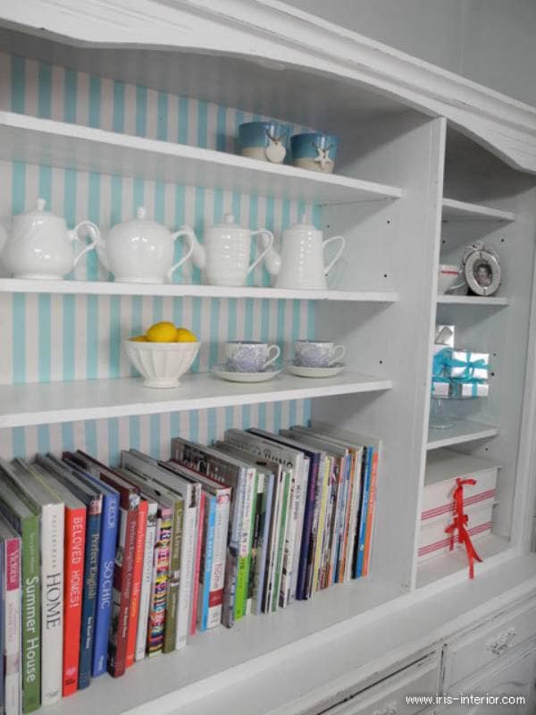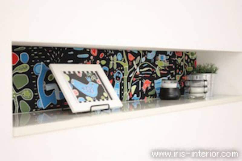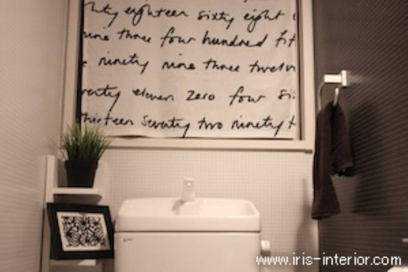 白と黒のトイレには、カーテンはIKEAのファブリックで自作しました。玄関はみんなが出入りする場所だから、少しでも空間を明るく見せたいといろいろ工夫しています。高さがなく横に長いニッチには、ファブリックを貼りつけて、ちょっと遊びのある、楽しい雰囲気のディスプレイにしてみました。