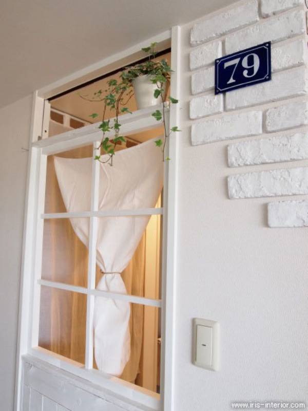 洗面室の窓横にはファブリックレンガとパリで買った番地プレートを付けてヨーロッパの街角のイメージで。玄関の壁も同様で、ファブリックレンガをむらをだしながらペイントしてはりつけています。