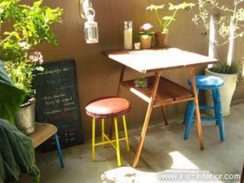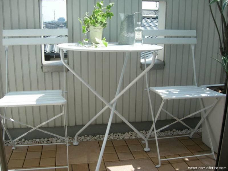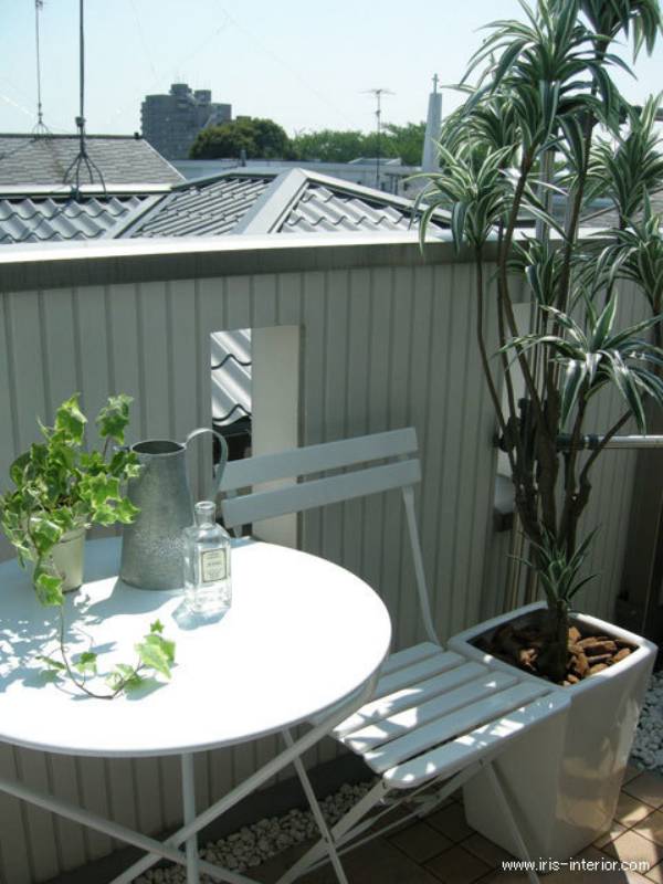3階のバルコニーでは、天気がいい日には食事をすることもあるという癒しの空間。テーブルと椅子は長い間探してやっと見つけた白のフレンチスタイルはみやびさんのこだわり。観葉植物がポイントになって、より癒し効果がありそうですね。
