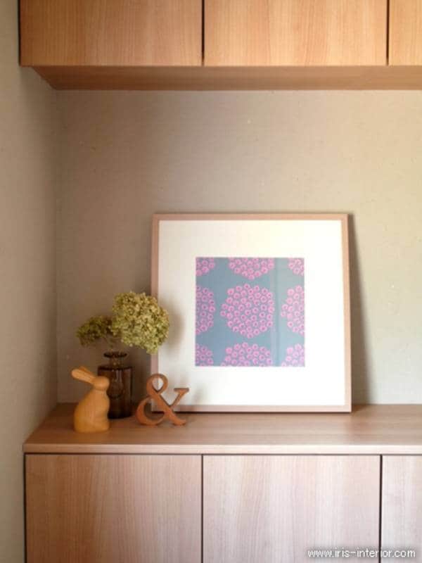 チェスト上の壁には、500円玉さんが春頃に作ったグリーンのパネル。シンプルインテリアの中に、パネルやファブリックなどを使っているので、色が映えてとても素敵です。小物を使って春を感じられる一工夫がされています。
