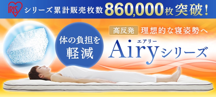 アイリスオーヤマでは、コイルマットレスやウレタンマットレスのデメリットを解消した高機能寝具を販売しています。特に、シリーズ累計86万枚を売り上げている[「エアリー」シリーズ]は、ほとんどのマットレスができない「丸洗い」が可能!中材もへたりにくく、機能も価格も大オススメの商品です。