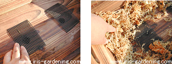 板の間に隙間があるときには湿らした水苔を隙間のあるところに敷いておくと、用土が漏れるのを防げます。この上に用土をサラッと入れてください。