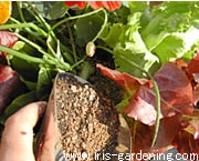 - @:野菜の場合あまり根はいじらない方が良いでしょう。 ただ今回のように浅めの容器を使用する場合、根鉢の上の方の土を下に向ける感じで用土を落してあげるとよいでしょう。