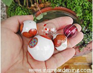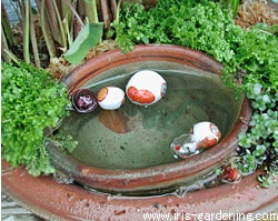 - B:さておまけです。材料には入れていませんが、フローティングボール(和風とガラス)を用意しました。この時期になると園芸店やホームセンター、雑貨屋さんなどで扱っていることと思います。これを浮かべるとより涼しげになります。