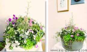 今回は口径28cmの器に14ポットも入っています。 こんなこんもりとしたうえ方は長く育てる鉢の中では無理がありますが、春までの仮住まいではOKでしょう? アレンジメントフラワーのようなハーモニー感が可愛いので、よく作っては楽しみ、その後に植え替えをしています。 1つずつ包んでいるため短期間に植え替えをしても、根の痛みが少ないのでオススメです。 穴が開いていないのと、水もちの良い水コケを使用しているので、水の与えすぎには注意してください。 表面の水こけが湿っているうちは与えないようにしましょうね。