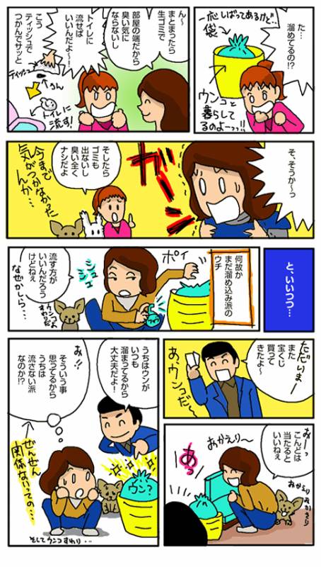 ただ、散歩時は、拾うときに石や枯れ葉が一緒になって、トイレに流すと詰まってしまう事もあるらしく、流したり、生ゴミにしたり・・・と、臨機応変に対応する事も必要みたいです。