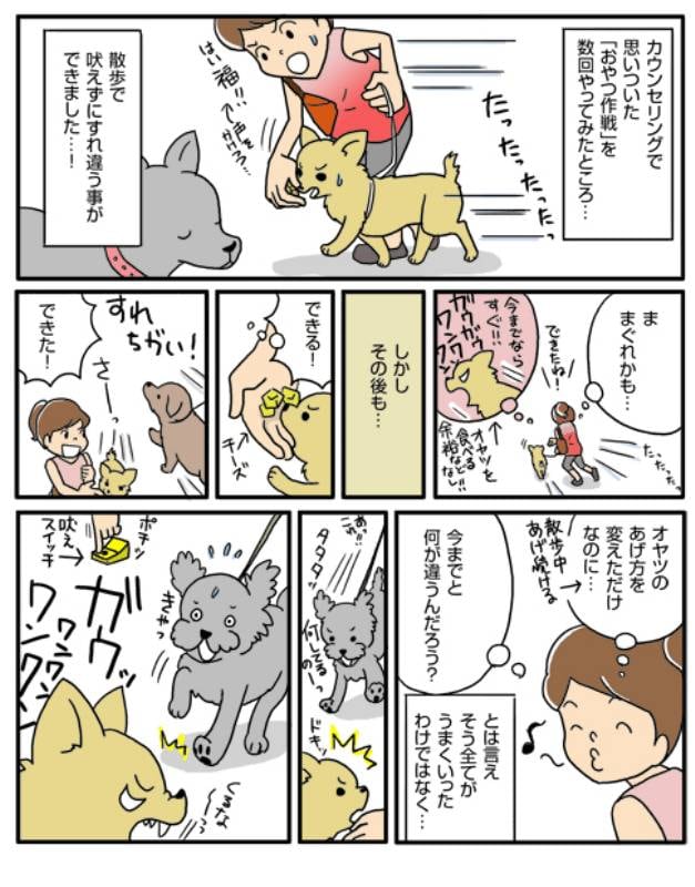 散歩に出た時から緊張してるので、今回の方法のように散歩中ずーっとオヤツをあげる事で、常に緊張を和らげてあげる事ができたようです。