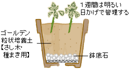 3 挿し穂の半分くらいを、ゴールデン粒状培養土【さし木・種まき用】に挿し、1週間は日陰で管理する。