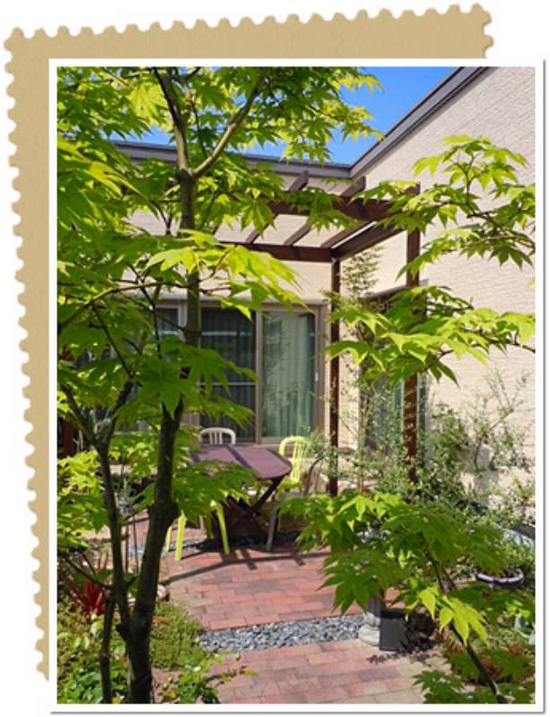 パーゴラの影が真っすぐ地面におりて、太陽から庭に初夏の合図です。一年一年、違う表情になっていく庭の木たち。それぞれ自分の葉っぱを広げて、今年もキラキラしています☆