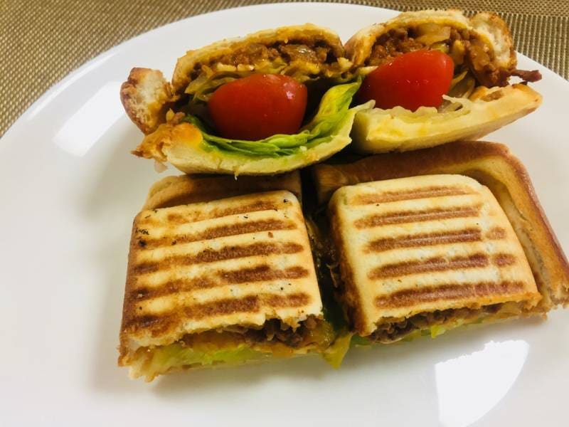 味の感想・・・私の住む沖縄にはタコスやタコライスが名物でありますが、それをホットサンドにしてみました。ミート、チーズ、レタス、トマトをたっぷり挟み彩りよく仕上がりました。
