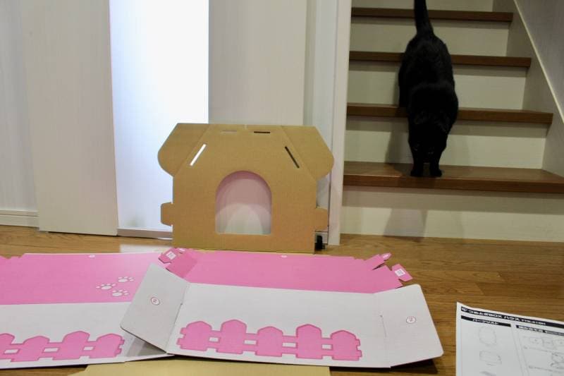 家の中に爪とぎをイン。裏に両面テープがついているので、研いでズレる心配はありません。説明書では家の真ん中につけていましたが、中でくつろぐ時に真ん中だと邪魔かなあと思い、端っこにつけました。