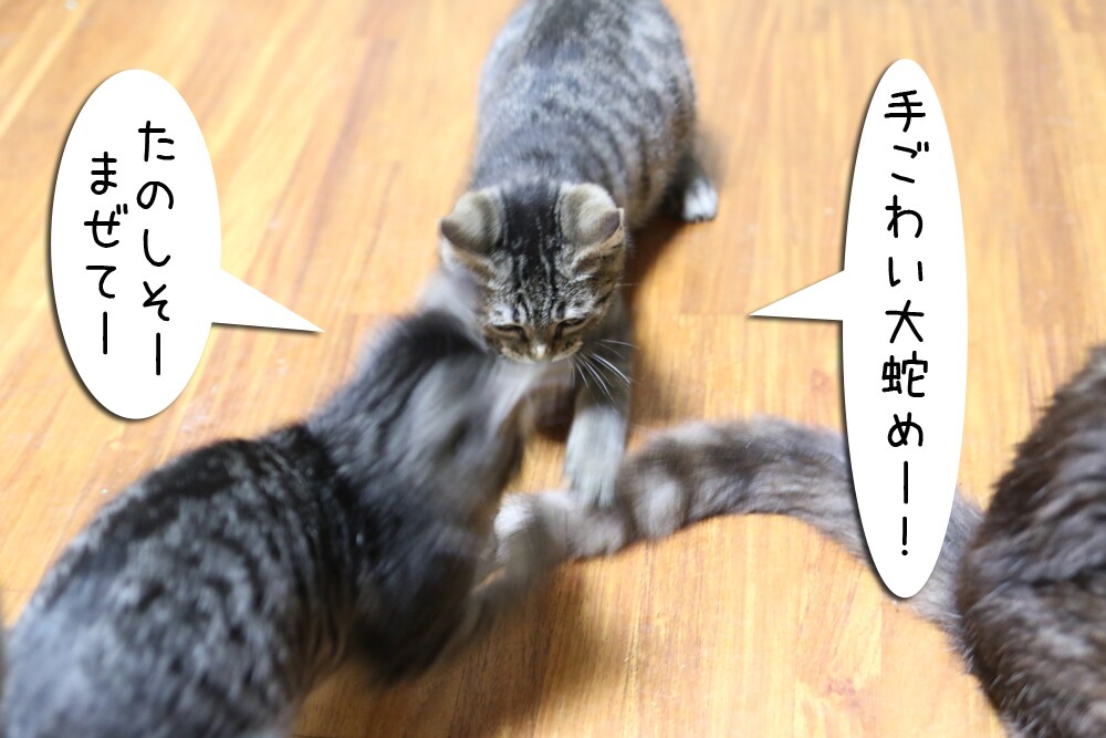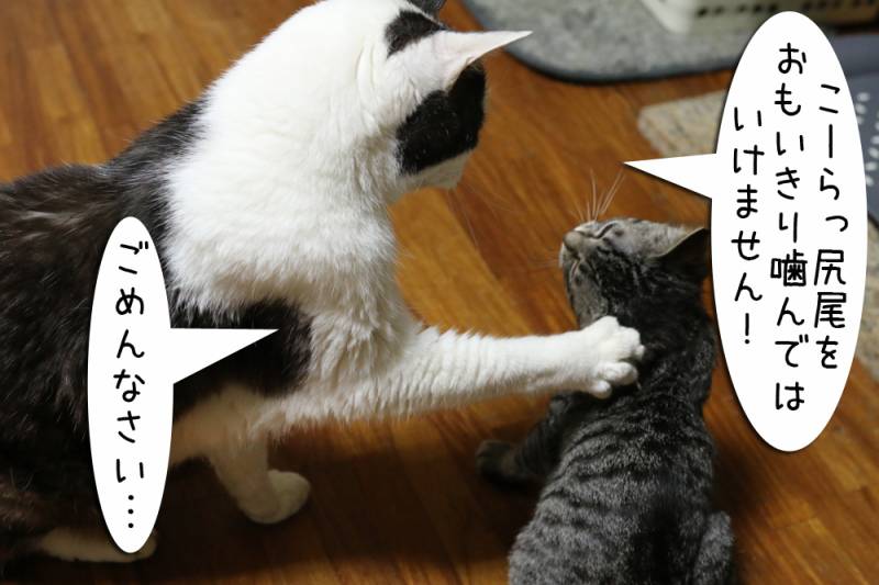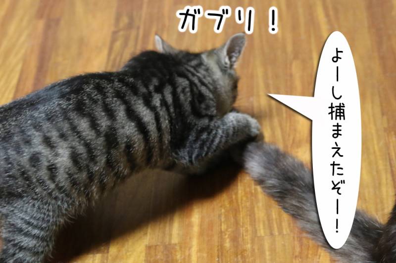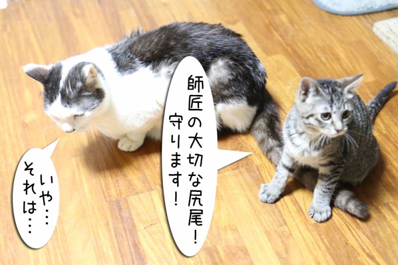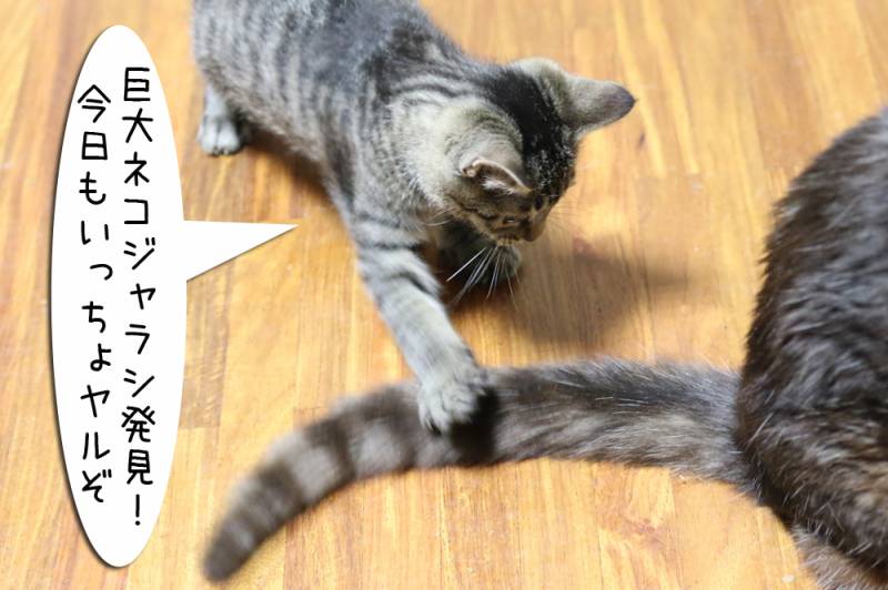 ムギの尻尾がまた子猫に狙われています。なぜいつも狙われる位置にいるのか…