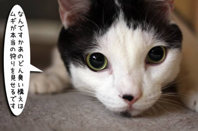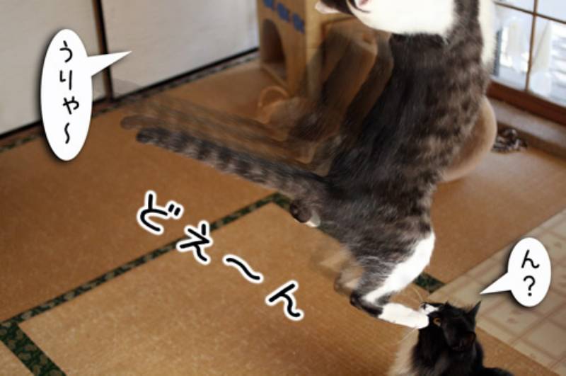 ぽーちゃんと猫じゃらしで遊んでみました。ドン臭くちょいちょいとやってるところに光る目が…。遠くからお尻プリプリして巨体が飛んできました。