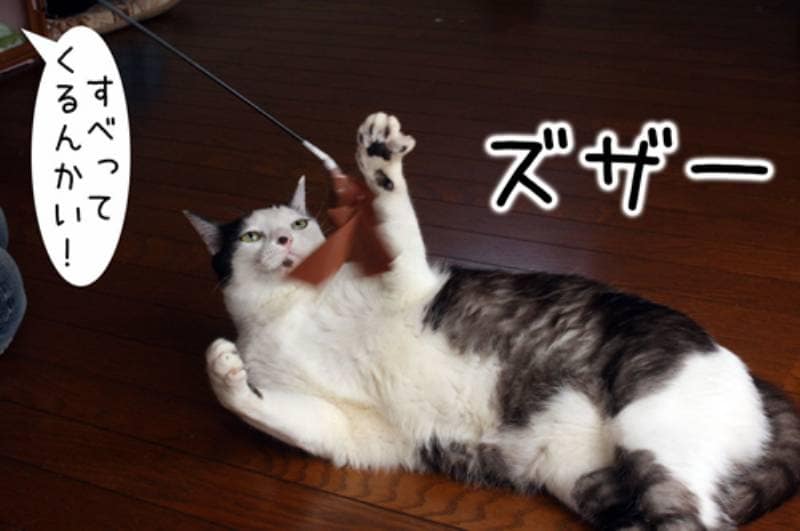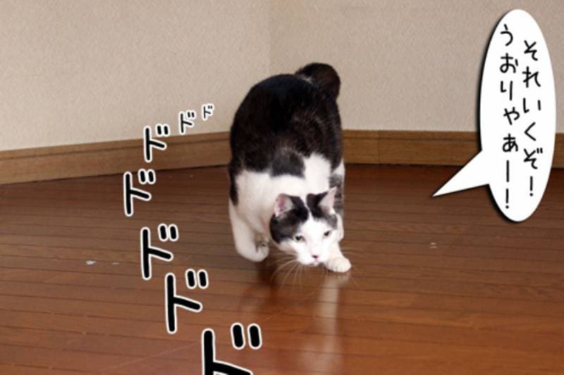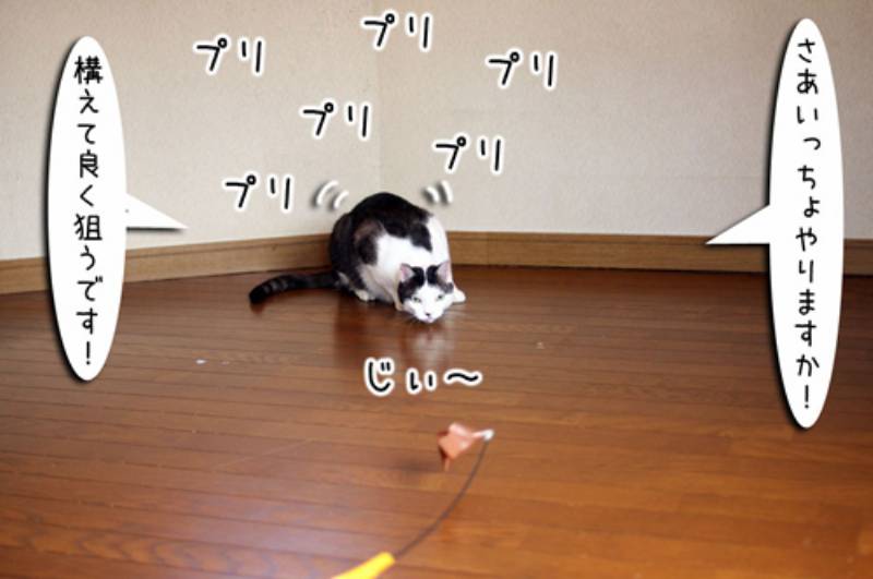 そこでムギがお手本をみせてくれることに。しっかり狙ってお尻フリフリ!すごく猫らしくねらっています。しかしムギのお手本は猫らしくない足音で滑ってきました。