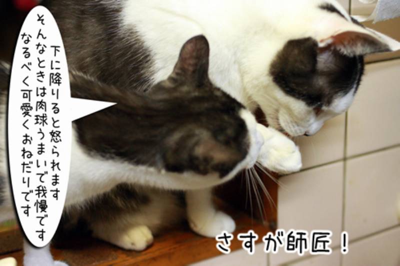 今日も子猫を誘って台所にやってきました。そこでじっと見つめてプレッシャーを与えてきます。盗もうとすると水攻めにされる事も教えます。