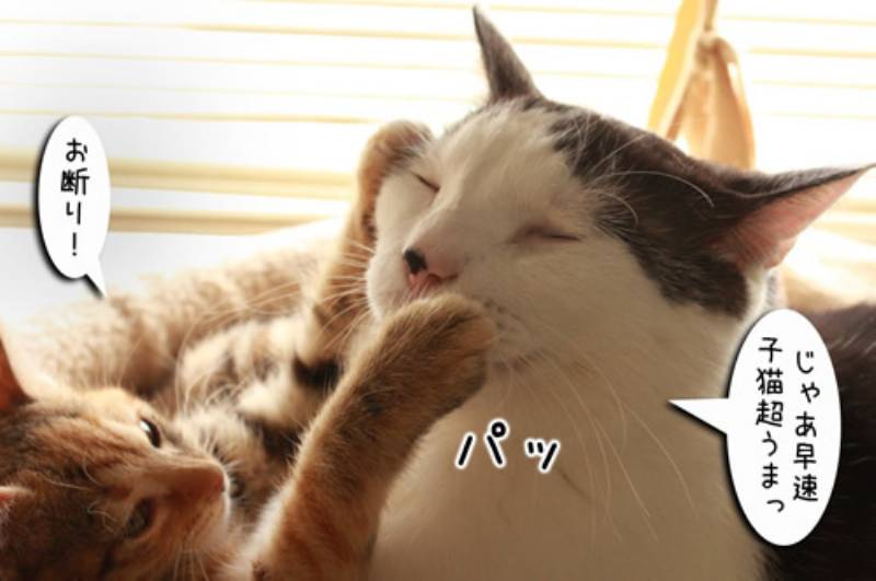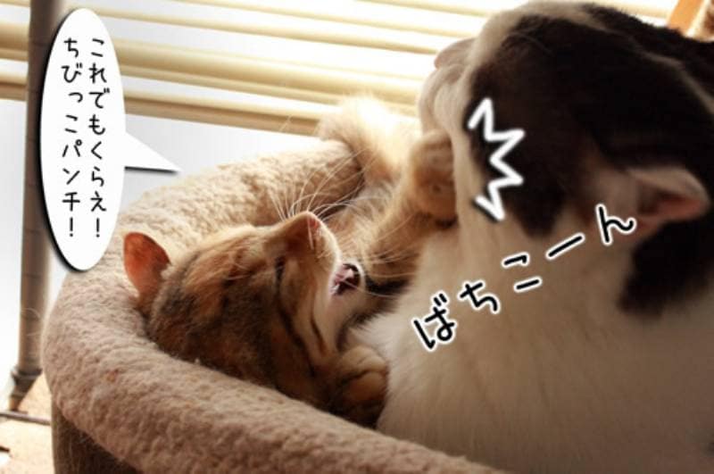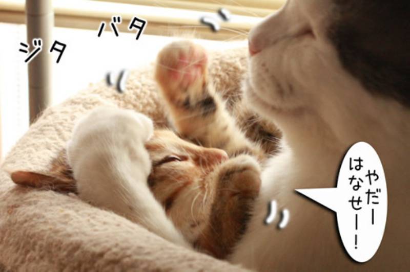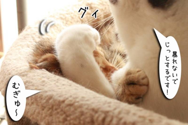 さっそく舐めようとするムギですが子猫も必死です。ガシッと抑えるけれど必死の抵抗にあい、ついに子猫ぱんちが炸裂です。