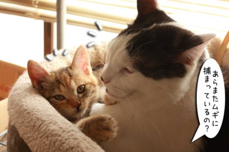 子猫をがっちり捕まえてるムギ。邪魔者もいないのでゆっくりと毛づくろいをするつもりなのでしょうか?