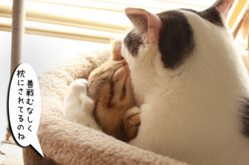ところがムギの肉にはあまり効果がなかったようです。たっぷりのお肉で枕にされてしまう子猫でした。