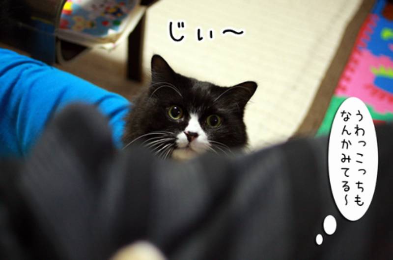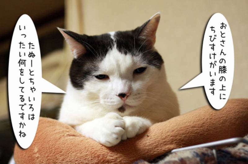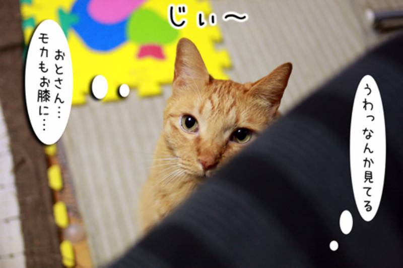 下を見ると、じぃーとモカとぽーちゃんが虎視眈々と膝の上を狙っているじゃありませんか。