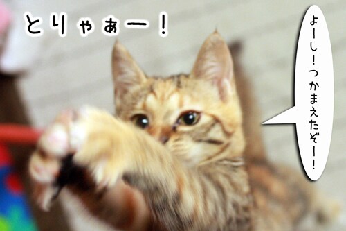 猫ジャラシで遊ぶ時間がやってきました。今日もがんばって捕まえようとするちびさんですが、なかなかうまく捕まえられません。