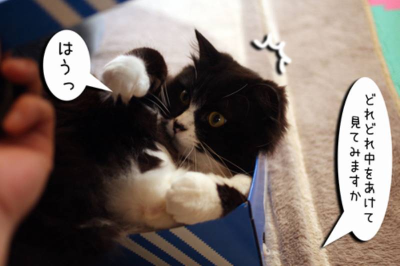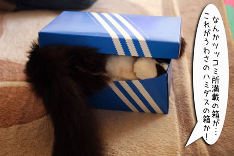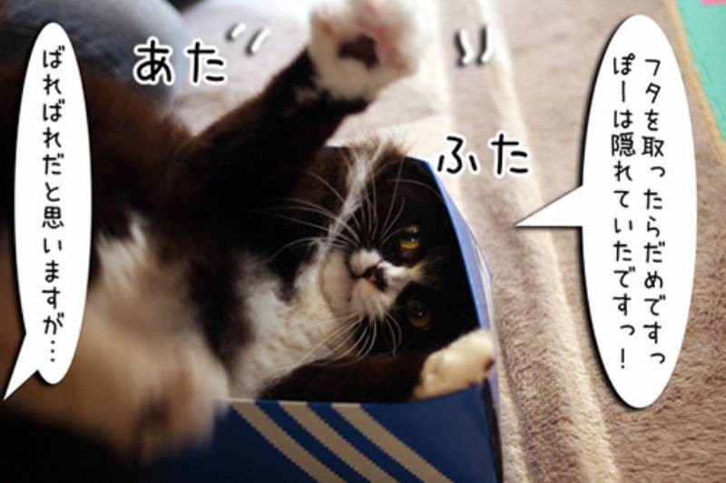 なにか変な箱を見つけた。どうやらぽーちゃんが入って隠れているつもりの様子。