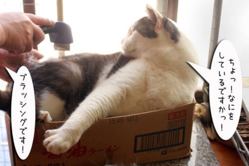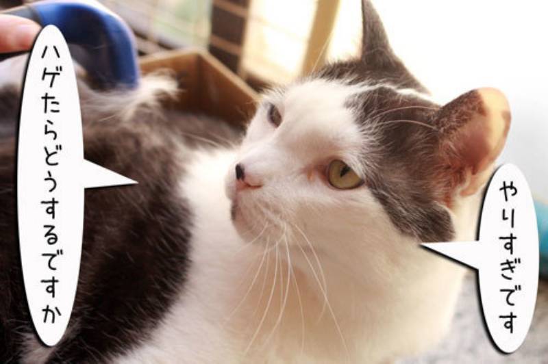 必死に抵抗するムギですが、かあちゃんには通じません。ガンガン抜け毛を集められてます。