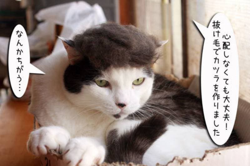 大量に集まったのでカツラを作ってかぶせてみましたが、とっても不満そうです。
