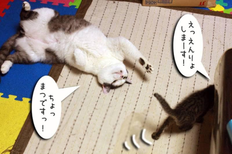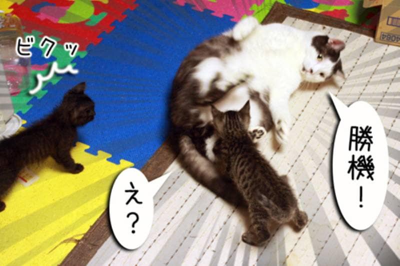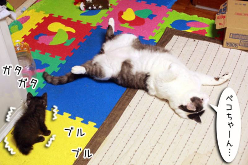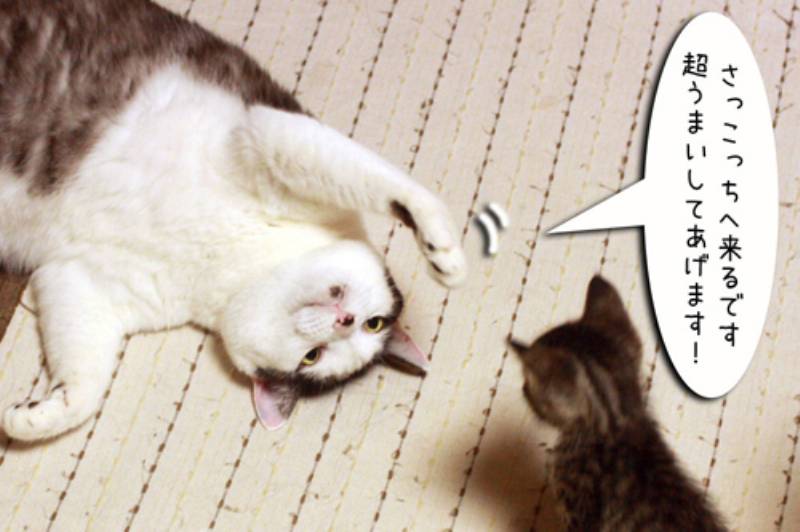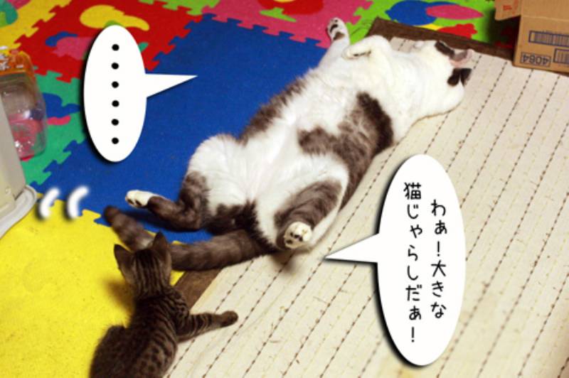 そんな事を知りもしない子猫さん。大きなムギの尻尾を猫ジャラシと勘違いして近づきます。