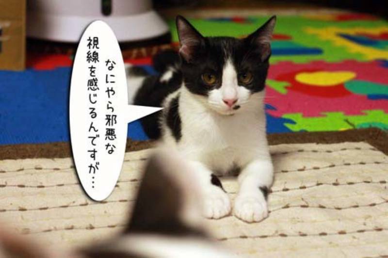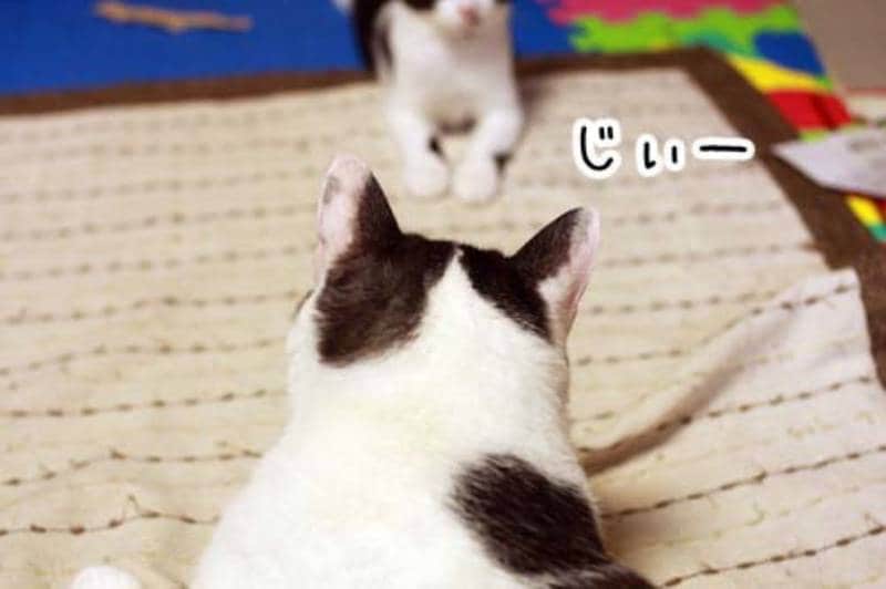 ムギが子猫をじっとみつめている。何を見つめているのでしょうか?