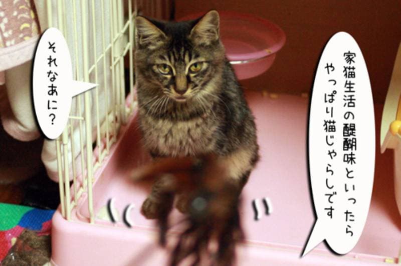新人の子猫さん。まだおっかなびっくりすごしています。緊張をほぐそうと猫ジャラシで誘ってみるも遊んだ事がないので遊び方がわかりません。