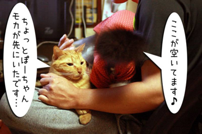 そこへぽーちゃんもやってきてモカがいるのに乗ってきちゃいました。