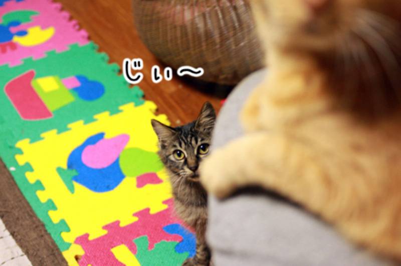 子猫さんが何をしているんだろうと不思議な顔をしてみていました。