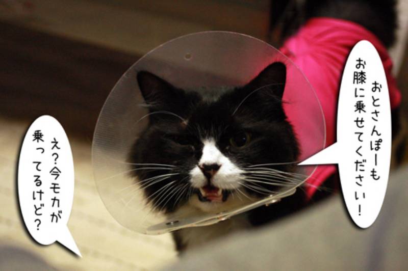 モカが大好きな父ちゃんの膝でくつろいでいます。そこに何か小さな視線を感じます。
