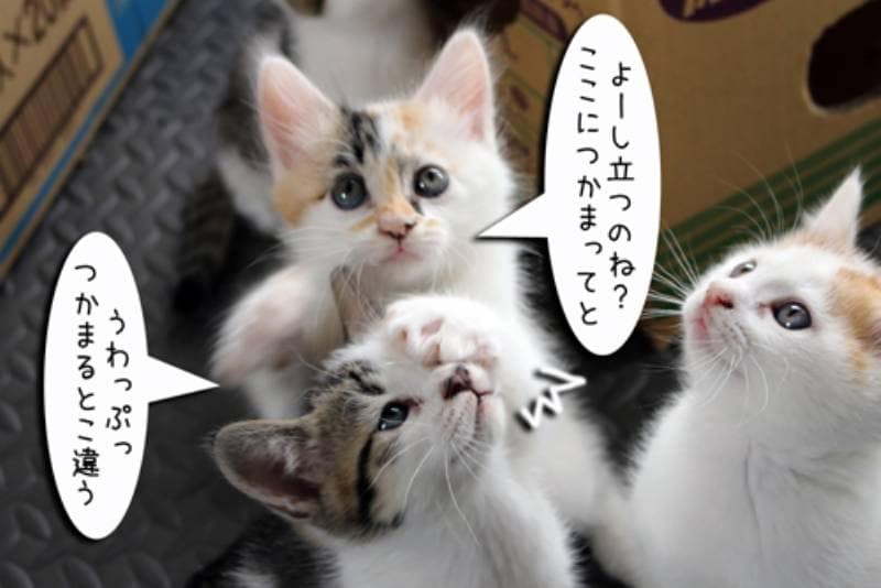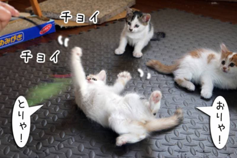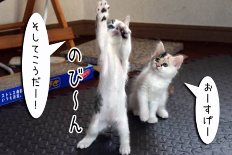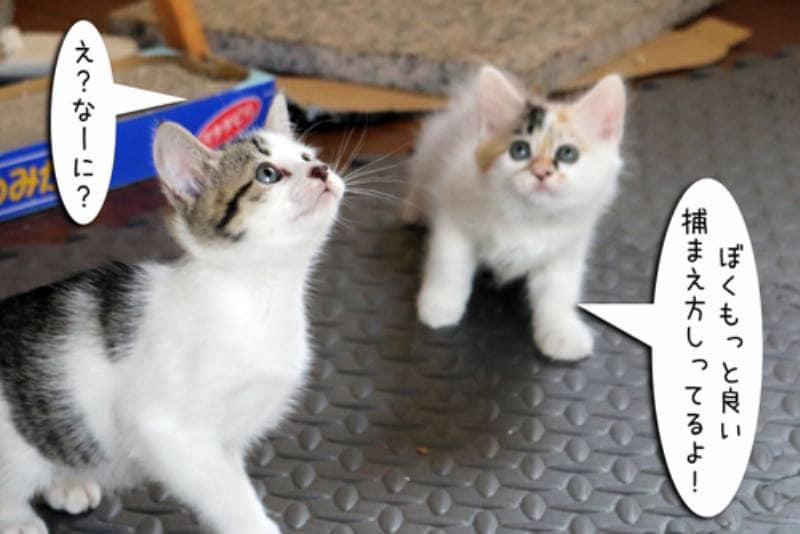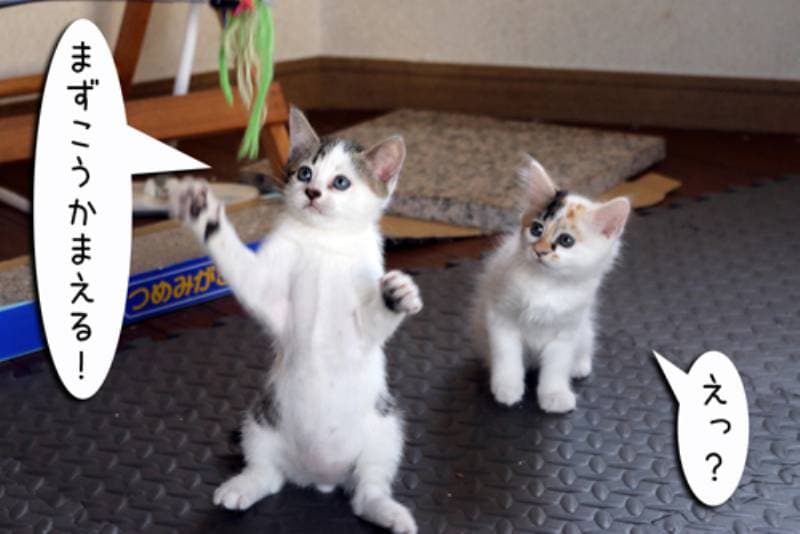 そこで小さい子猫なりに考えました。2本足で立つこと!これなら両手で捕まえられます。