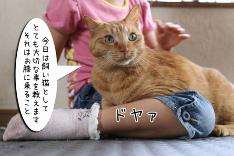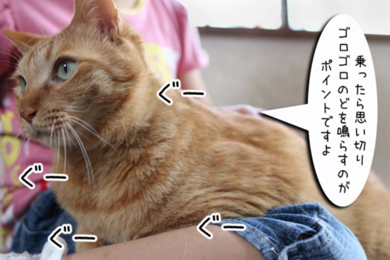 今日は人間に甘えるやり方を教えてあげるみたいです。モカがまず見本に膝に乗って甘えて見せます。ぐーぐー大音量でのどを鳴らしてドヤ顔です。