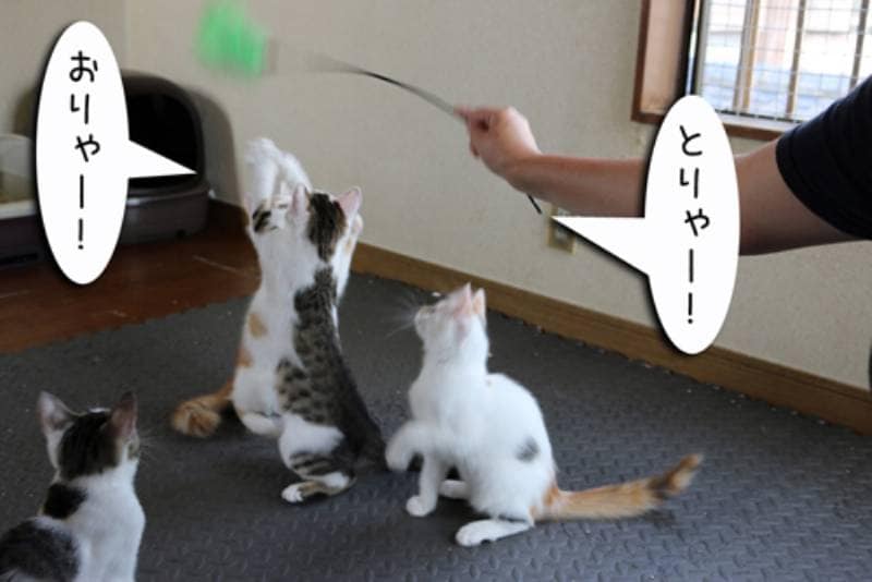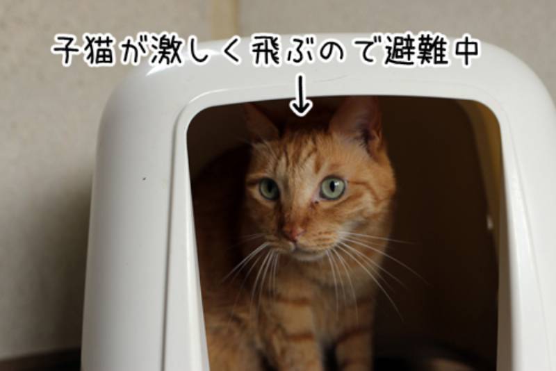 子猫の部屋のトイレ掃除に行くとモカがついてきます。子猫が遊びに夢中になるとモカは踏まれたりするので避難します。