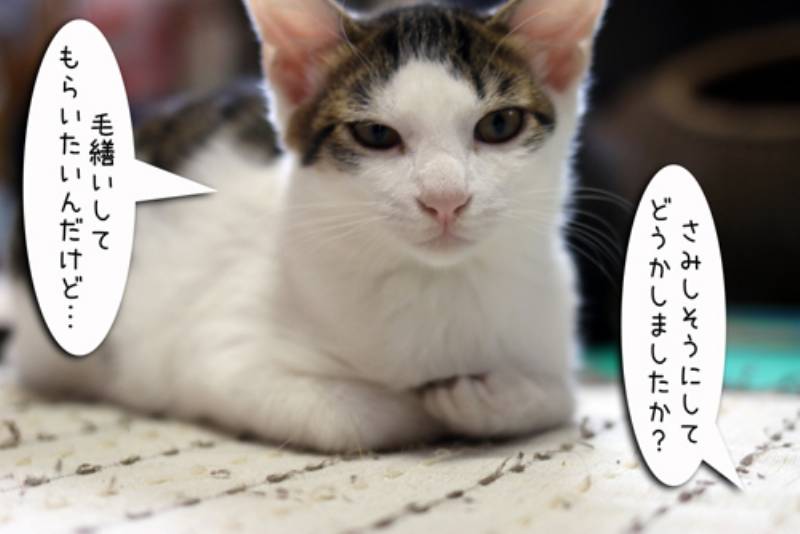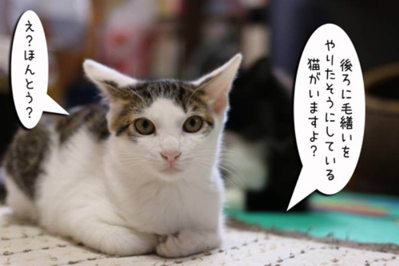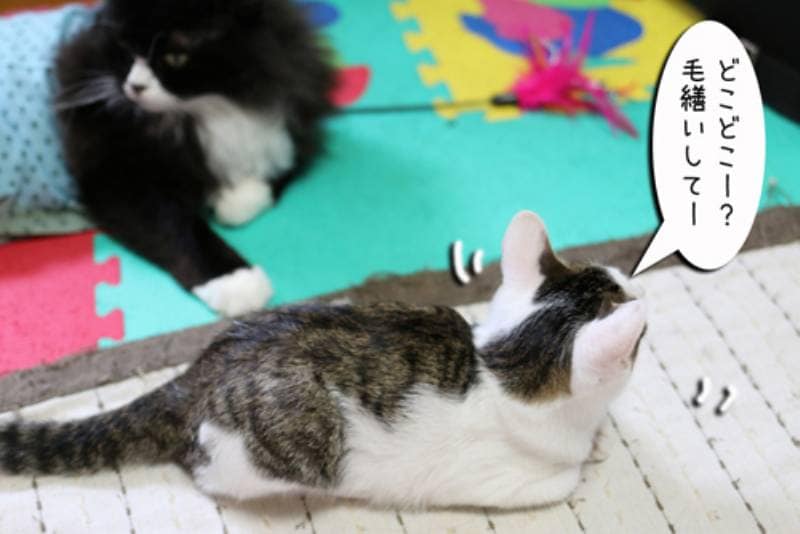 何か寂しそうにしている子猫さん。いつも毛繕いをしてくれるモカが今日はなんだか忙しいようです。