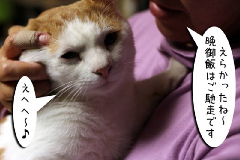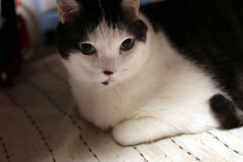 はちわれの男の子。ビビリで人見知り。頭の中はササミ一色。