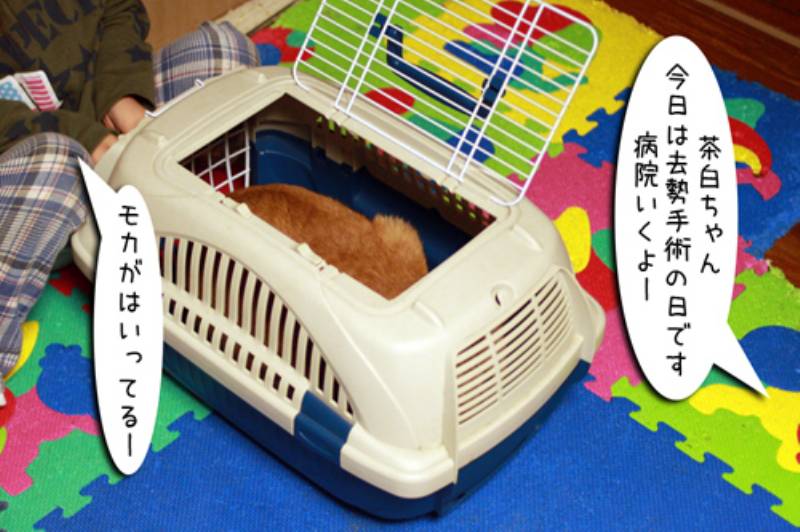 今日は大人猫で保護された茶白くんの去勢の日です。キャリーを用意しているといつものようにモカがはいっています。