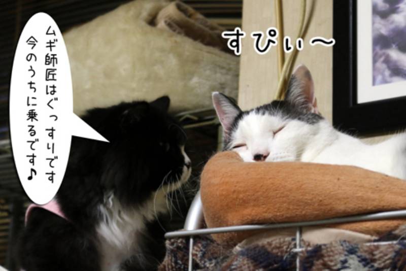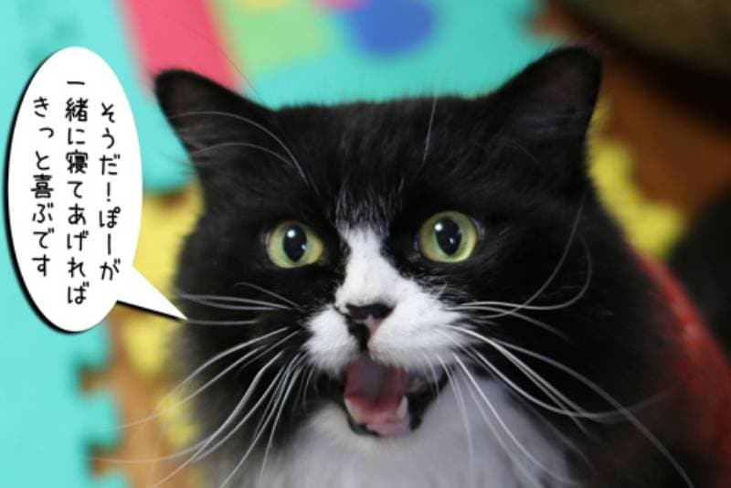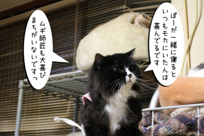 断られたぽーちゃんは、その上で寝ているムギを見つけました。