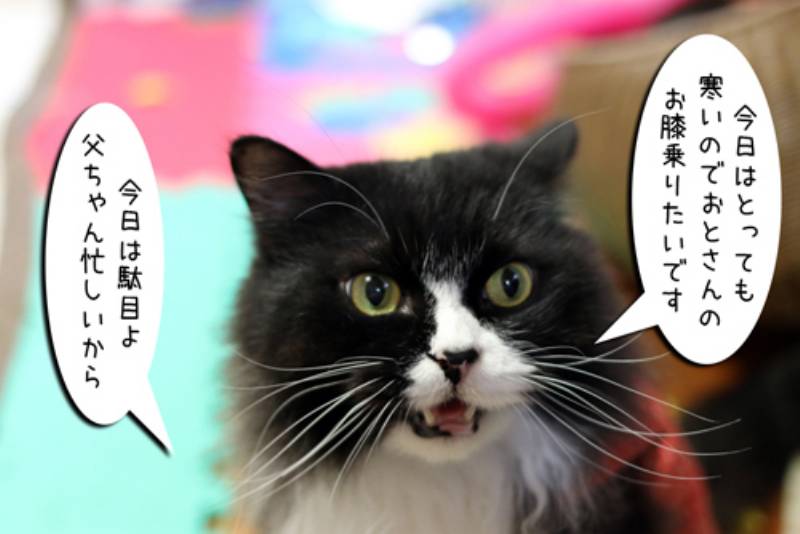 ぽーちゃんはお仕事のお手伝いに膝に乗ってあげようとしますが、邪魔でしかありません。