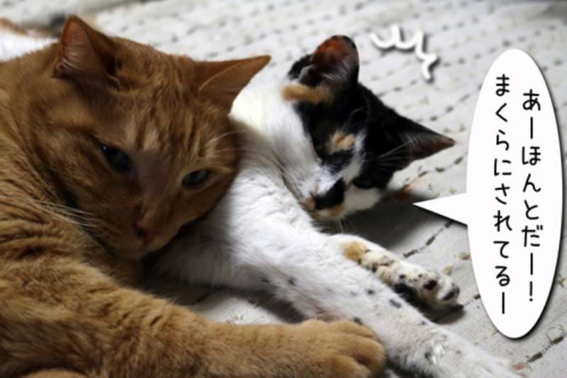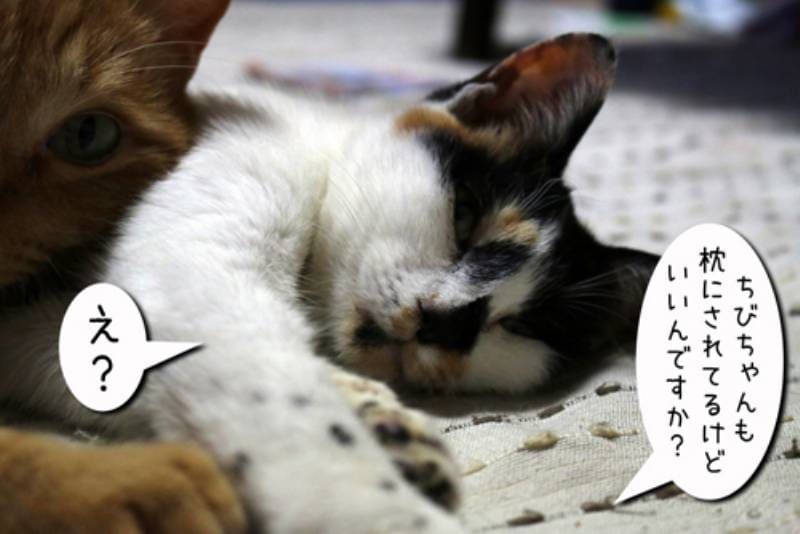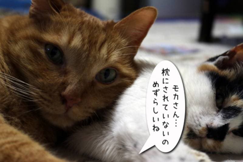 いつも枕にされる事の多いモカですが今日は子猫を枕にして寝ています。