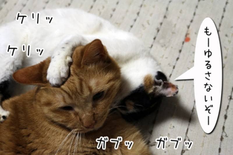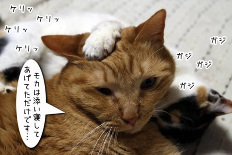 スヤスヤと寝ていたミケネコさんでしたが、まくらにされていると気がつくとモカにガブガブとケリケリでもう抗議。