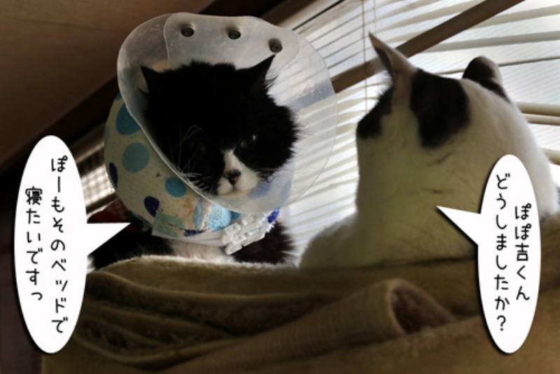 必死で守ろうとするムギですが一緒に寝たいぽーちゃんには伝わりません。 ベッドを守りたいムギと一緒に寝たいぽーちゃんの譲れない戦いは続くのでした。