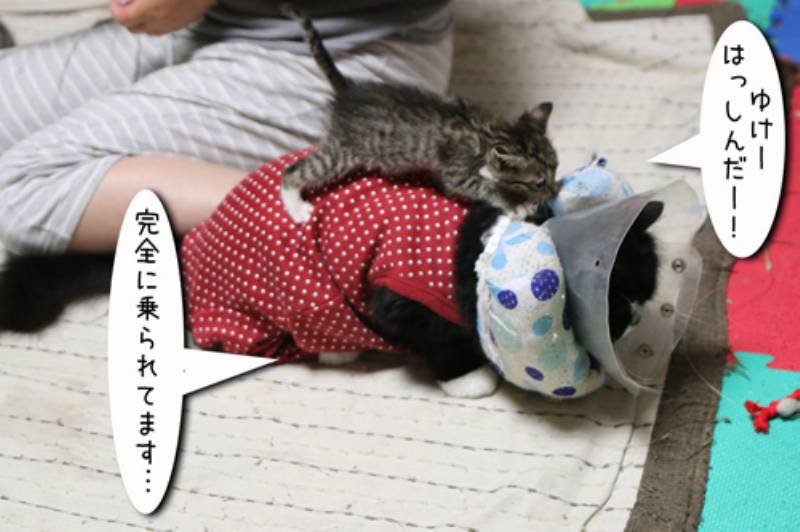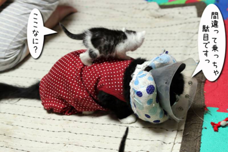 ぽーちゃんも新しく来た子猫を見に来ました。しかしエリザベスカラーをして服を着ているぽーちゃんは子猫には猫に見えないようです。