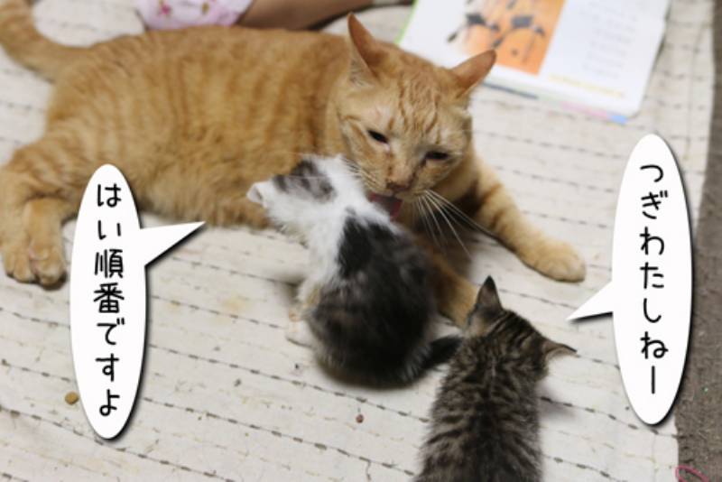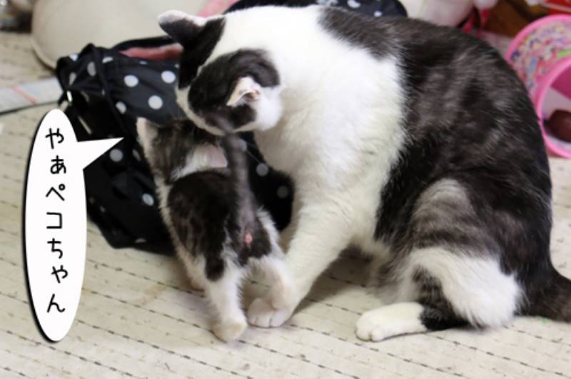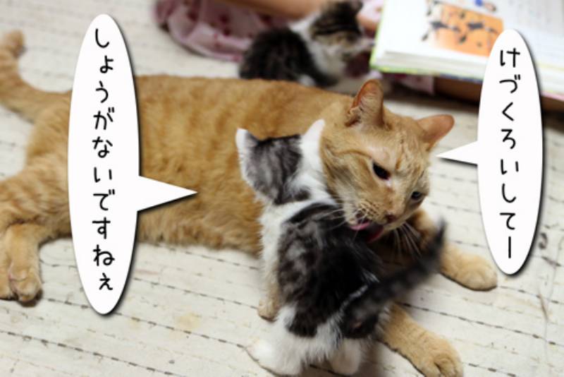 我が家の先住猫はとても子猫に優しいです。それを知っている子猫たちは今日も先住さんに甘えます。