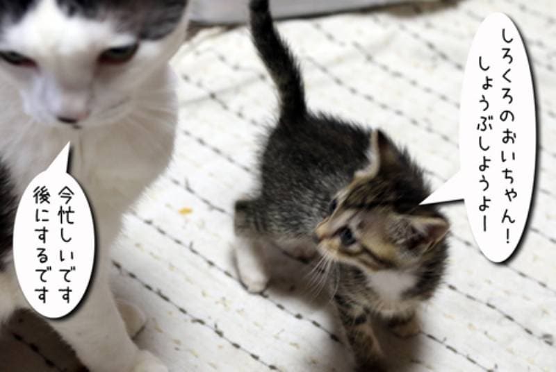 白ブチの男の子。ムギ師匠の意思を受け継ぐ者。父ちゃん大好き。