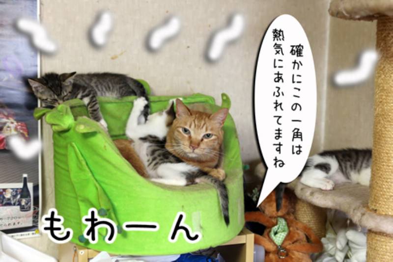 ほかにも沢山寝る場所があるだろうに、なぜかモカの周りには子猫たちが集まります。