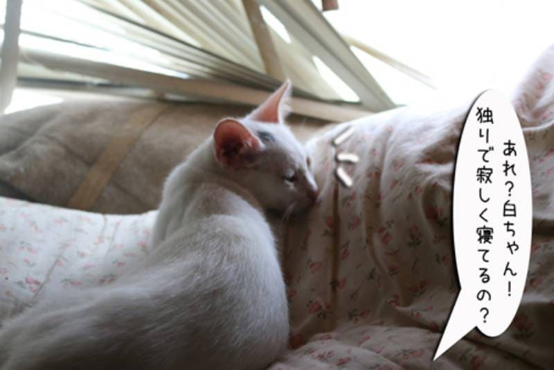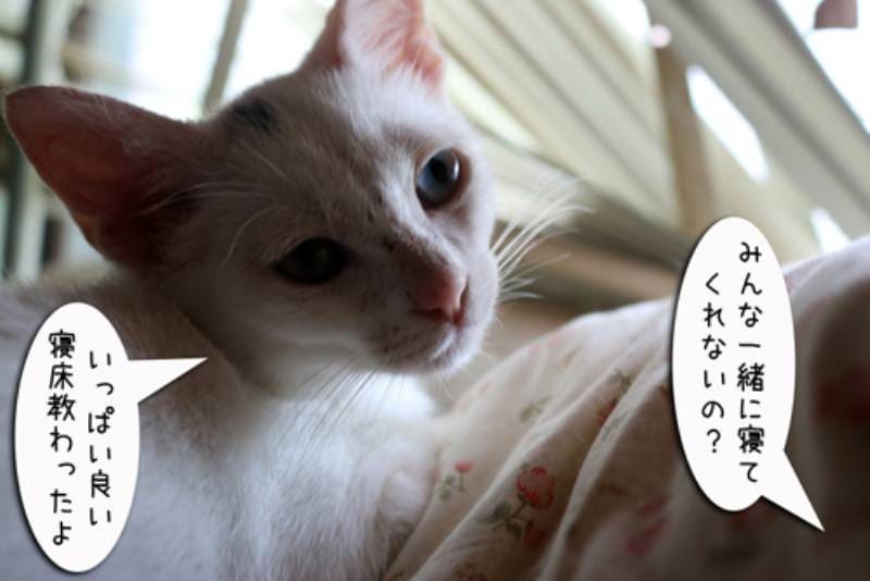 娘の横で寝るのも大好き。しかし一番大好きな寝床はやはりみんな固まっての猫団子です。 良い寝床を見つける天才の子猫さんなのでした。